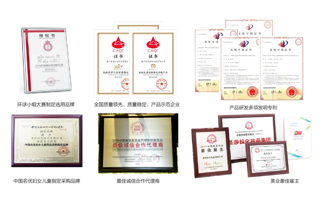多年来连获《美业最 佳雇主》《全国质量诚信标杆典型企业》《全国质量检验稳定合格产品》《全国质量诚信优秀企业》《全国美容行业质量领 先品牌》等荣誉,获得广大客户的认可。