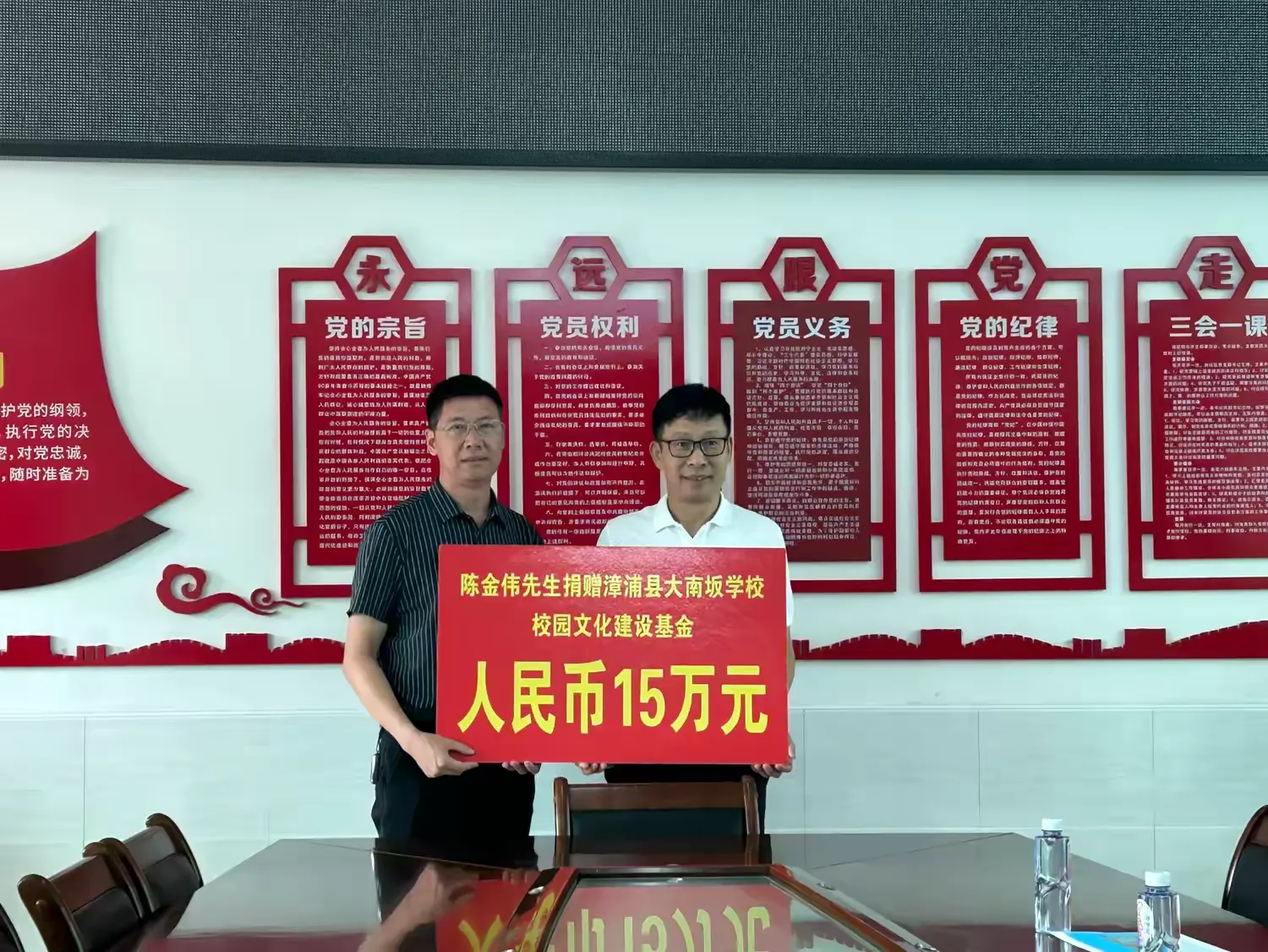 陈金伟先生捐赠大南坂学校校园文化建设基金人民币15万元。